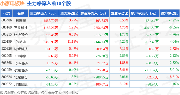 从资金动态观察,当日小家电板块主力资金净流出规模达3308.4万元,显示机构投资者调仓意愿较强。与此形成对比的是,游资资金净流入3192.62万元,散户资金净流入115.77万元,表明中小投资者对该板块仍保持一定关注度。这种资金结构变化或与板块内个股基本面分化有关。