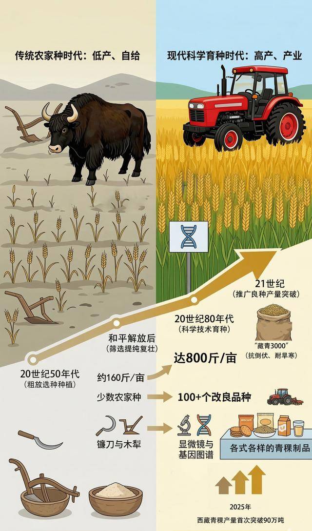 土地的蜕变同样震撼人心。81岁的卓玛吾珠回忆起上世纪60年代春耕场景:"一亩地能捡出五十筐石头,锄头刨下去火星直冒。"如今结巴村超五成耕地完成高标准改造,454.62万亩集中连片农田实现"田成方、渠相通、路相连"。在35个粮食主产县区,改良后的耕地等级平均提升0.16个等级,配合"藏青3000"等抗逆品种推广,青稞亩产从300斤跃升至800斤,2025年全区粮食产量首次突破90万吨大关。