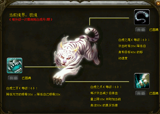 虎尾:凝血煞于锋,暴击时敌寇要害绽赤莲。正是因虎尾甲透骨三寸、血溅七步而得。虎魄进阶:每破一重境界,甲锋锐利三分。