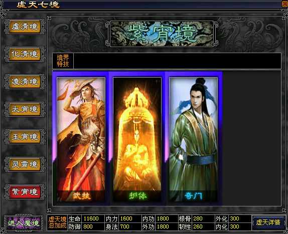 虚天七境,层层皆有玄机。每层境界都巧妙地分为3个分支,如同三条不同的武学小径,通向不同的巅峰。