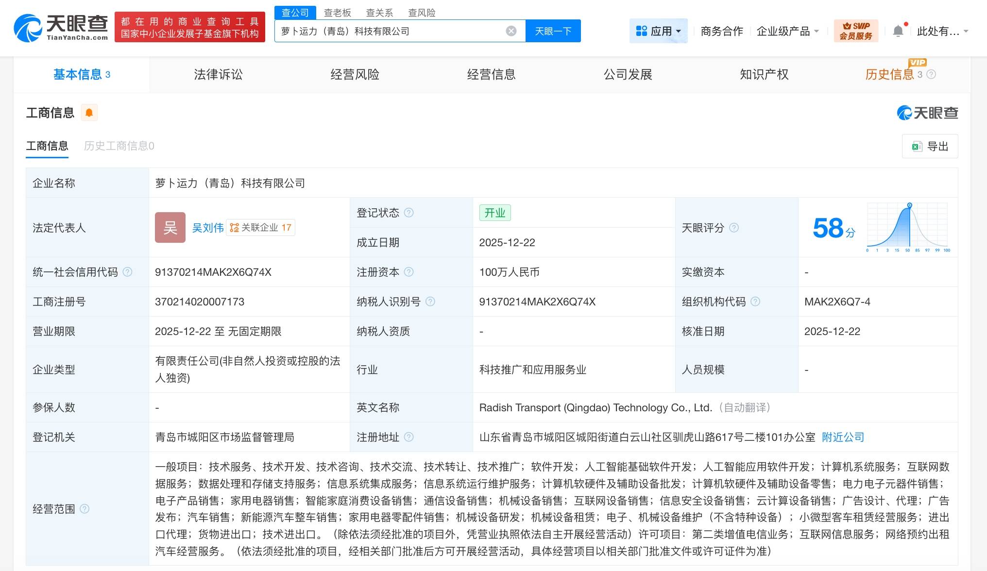 近日,一家名为萝卜运力(青岛)科技有限公司的新企业正式注册成立,引发市场关注。该公司法定代表人为吴刘伟,注册资本达100万元人民币,由萝卜快跑关联企业萝卜运力(北京)科技有限公司全资控股。