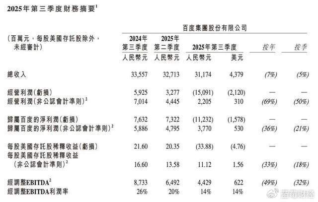 百度近期发布的第三季度财报引发市场高度关注,数据显示其营收与利润出现显著波动。报告期内公司总收入311.74亿元,同比下降7%,创下历史最大季度跌幅,叠加资产减值影响后净亏损达112亿元,与去年同期76.32亿元净利润形成鲜明对比。这种剧烈变化被业内视为企业战略转型期的典型阵痛。