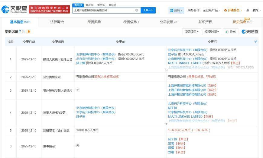 上海开物纪智能科技有限公司近期完成工商信息更新,新增股东阵容中出现百度系投资机构身影。三亚百川致新私募股权投资基金合伙企业(有限合伙)与上海蓝驰新皓创业投资合伙企业(有限合伙)等机构正式入股,推动公司注册资本从10万元增至约13.6万元。伴随股权结构调整,企业高管团队同步发生人员变动。